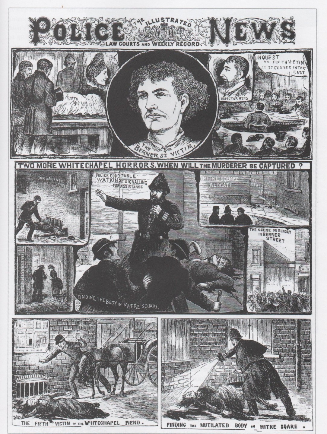 P.C. Alfred Long of H Division stepped into a narrow alley off Goulston Street, Whitechapel, the entryway to the Wentworth Model Dwellings. He found a bloodstained rag--which later proved to be the missing portion of Catharine Eddowes' apron--and a message written on the black brick wall in chalk: